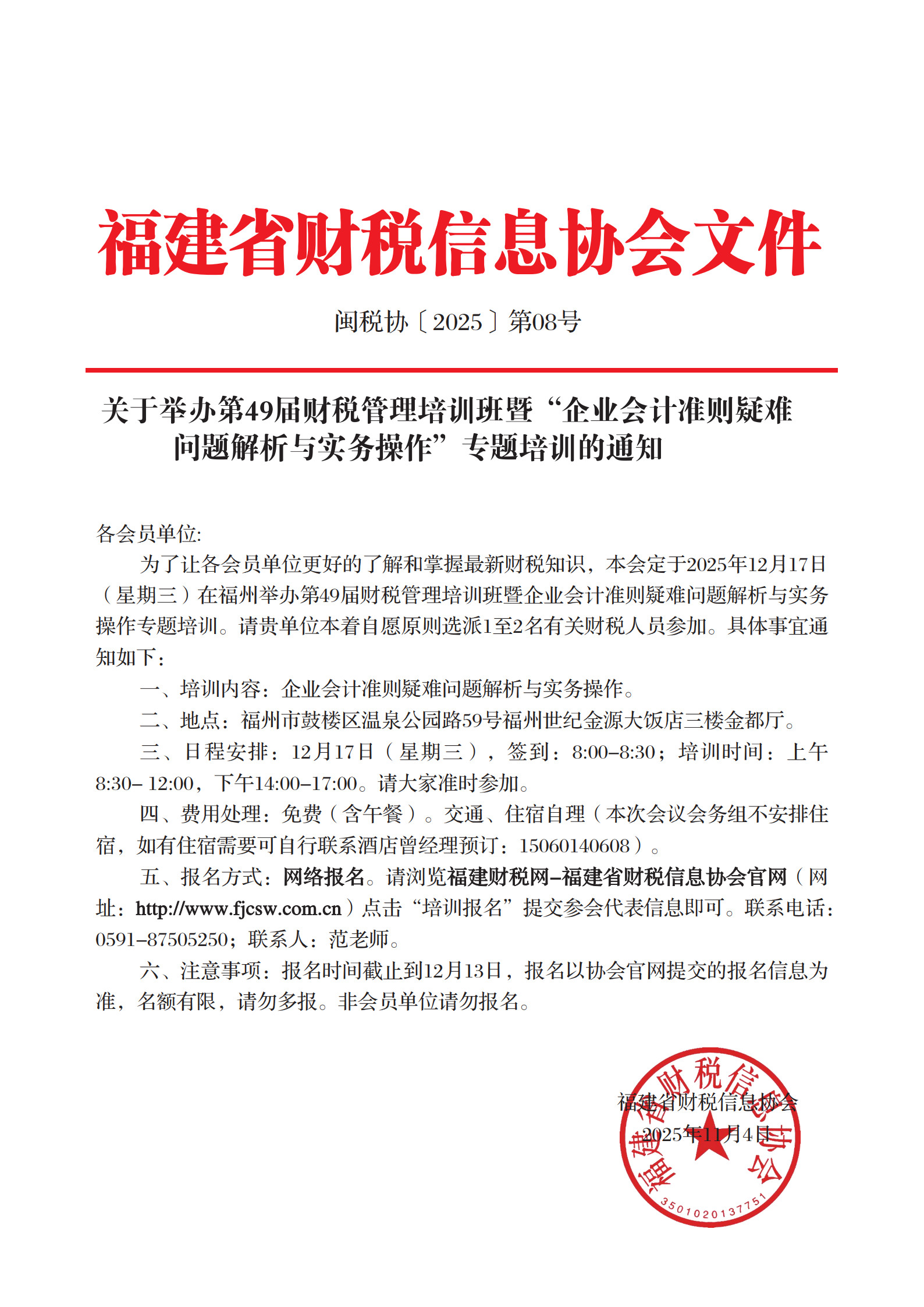 为了让各会员单位更好的了解和掌握最新财税知识,本会定于2025年12月17日(星期三)在福州举办第49届财税管理培训班暨企业会计准则疑难问题解析与实务操作专题培训,请贵单位本着自愿原则选派1至2名有关财税人员参加。